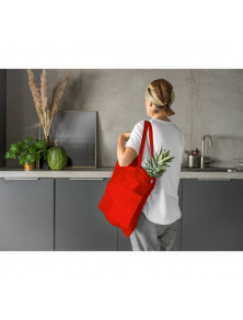 Taška zo 100% recyklovanej bavlny (180 g/m²), s uchami 65 cm. Recyklovaná bavlna je jednofarebná a nefarbená. Surovina sa používa vo svojej pôvodnej forme a farbe, bez použitia farbív alebo bieliacich chemikálií, čo prispieva k nižšiemu vplyvu. Plná farba sa získa výberom recyklovanej priadze s rovnakým odtieňom a môžu sa objaviť nečistoty a farebné variácie